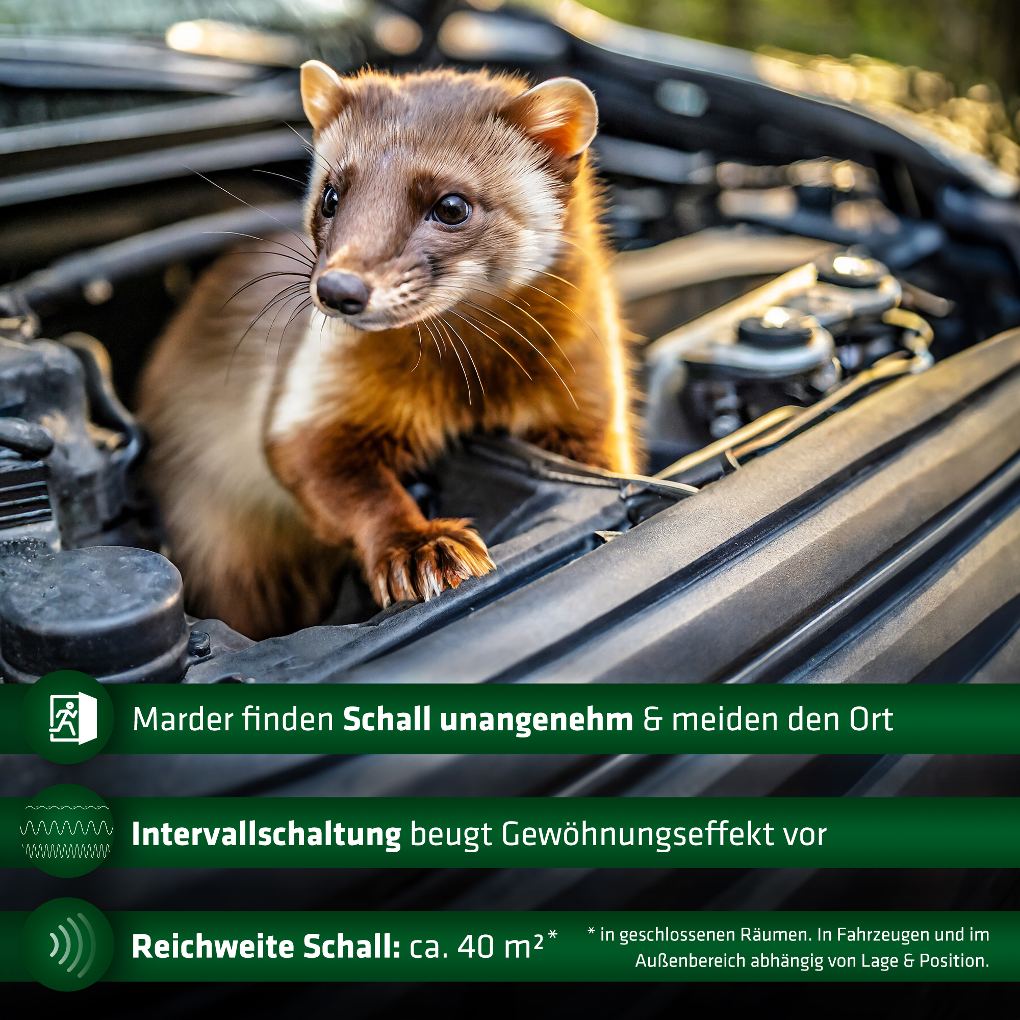 Informations sur le produit "Répulsif anti martres à ultrasons - Protection mobile et sans branchement"
