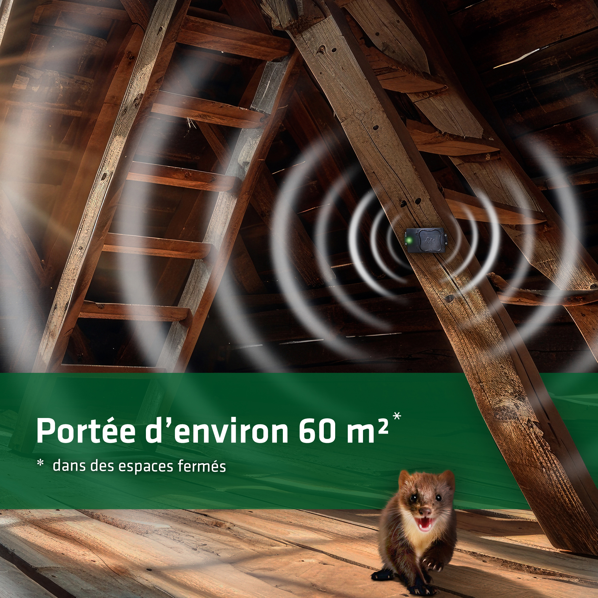 Protégez vos biens des martres grâce à des fréquences alternantes de 12 à 24 kHz, y compris les ultrasons. Cette technologie innovante empêche l’habituation et garantit une protection continue et efficace