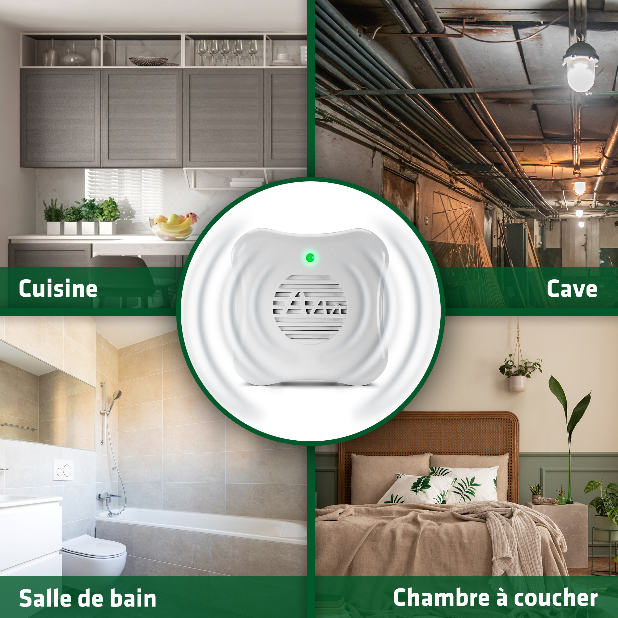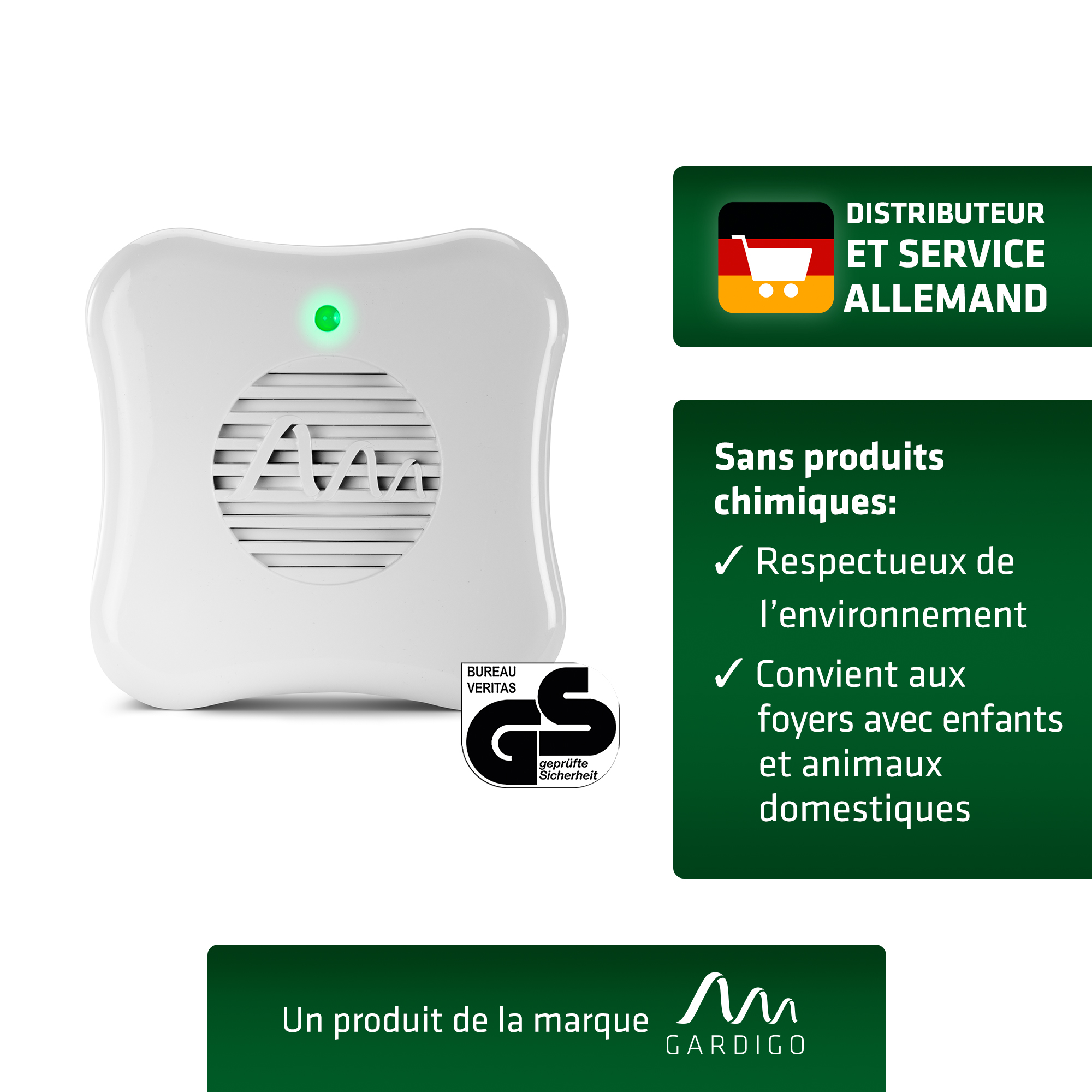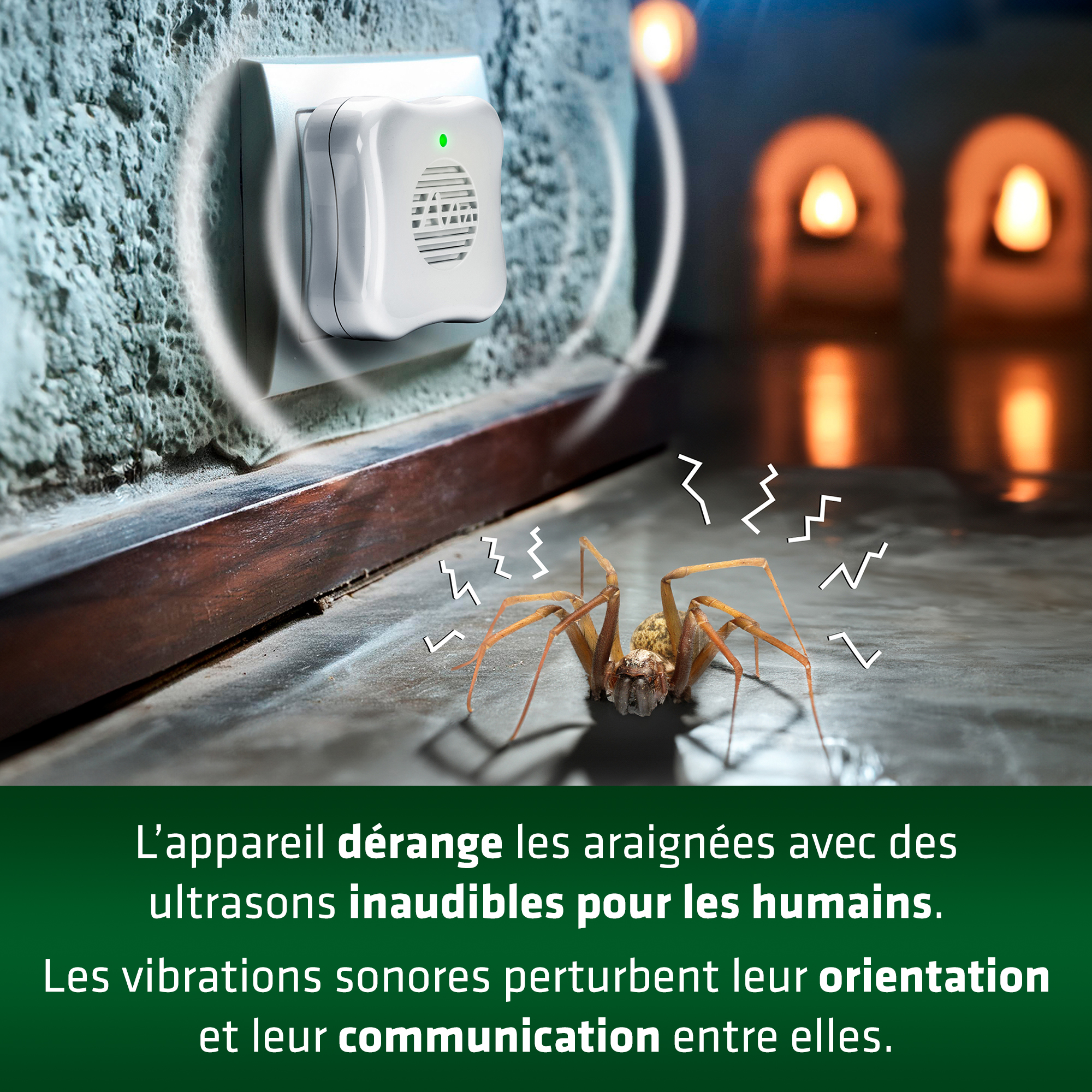 Le Répulsif Araignées GARDIGO émet des ultrasons à très haute fréquence que les humains ne perçoivent pas, mais qui dérangent les araignées. Cela les pousse à éviter durablement les pièces traitées.