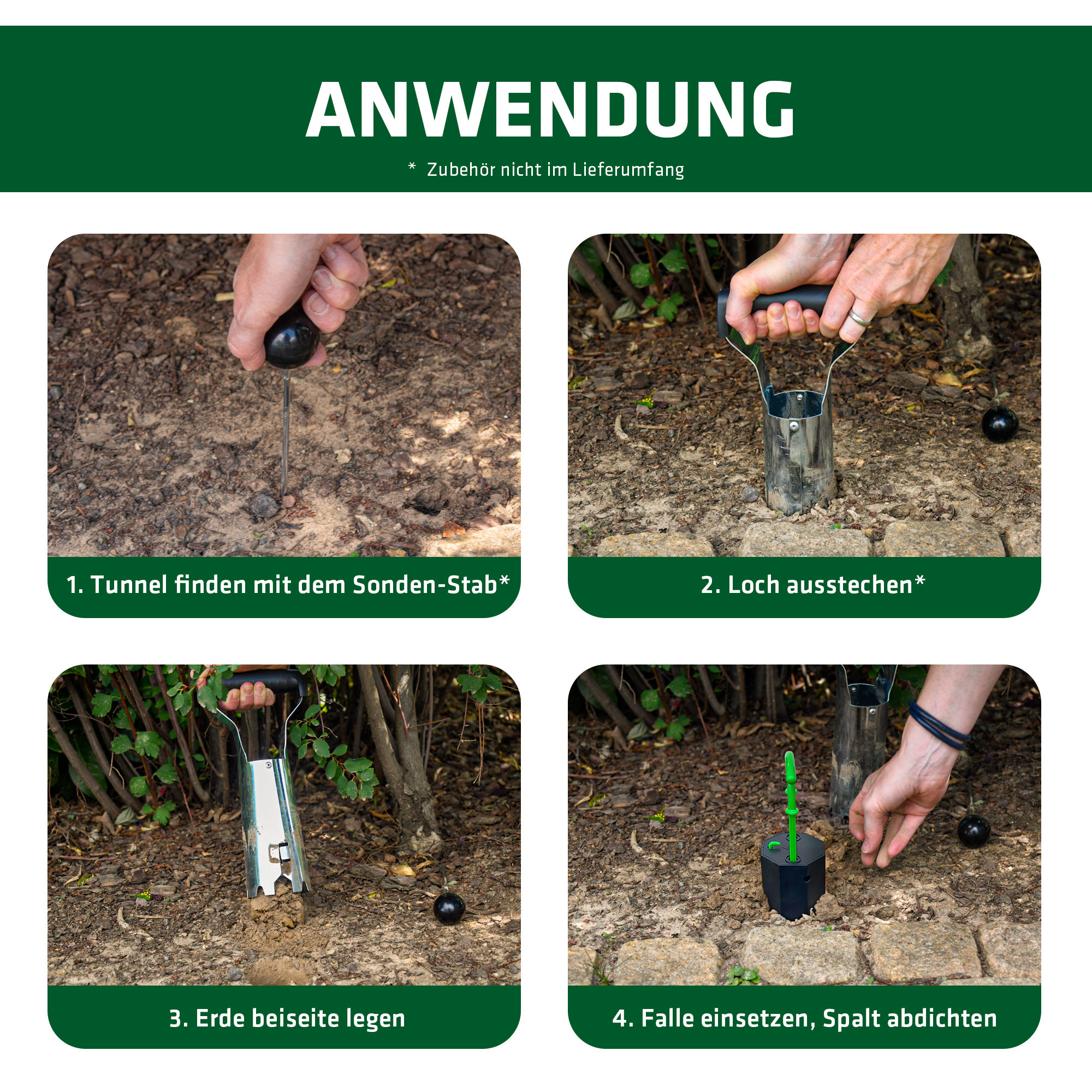 Les galeries se trouvent juste sous la surface du sol et peuvent être visibles à l’œil nu. Sinon, enfoncez un tuteur métallique dans le sol : s’il s’enfonce facilement puis bute, vous avez trouvé un tunnel. Creusez ensuite une ouverture à l’aide d’un outil adapté. GARDIGO propose également un kit d’accessoires pour faciliter cette étape.