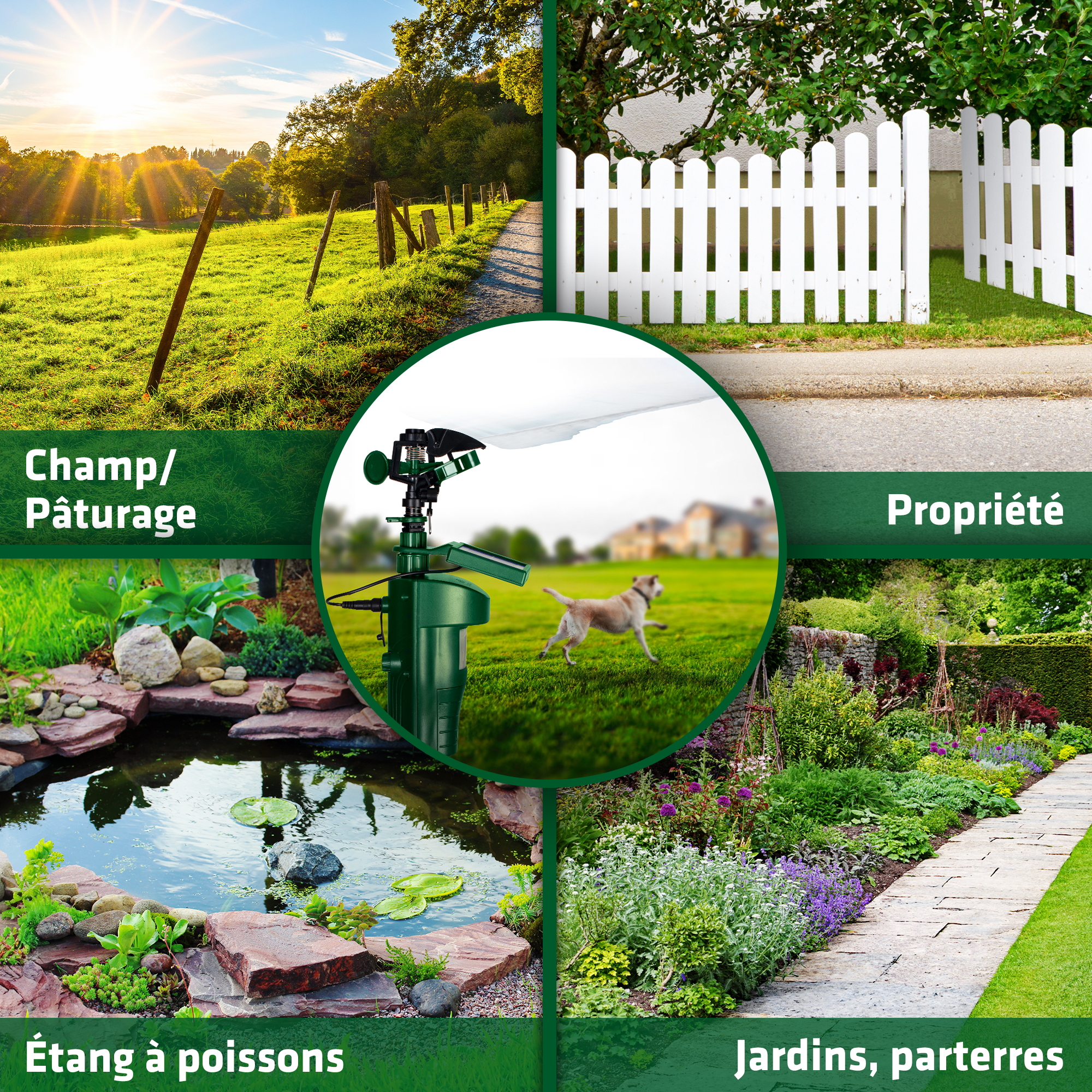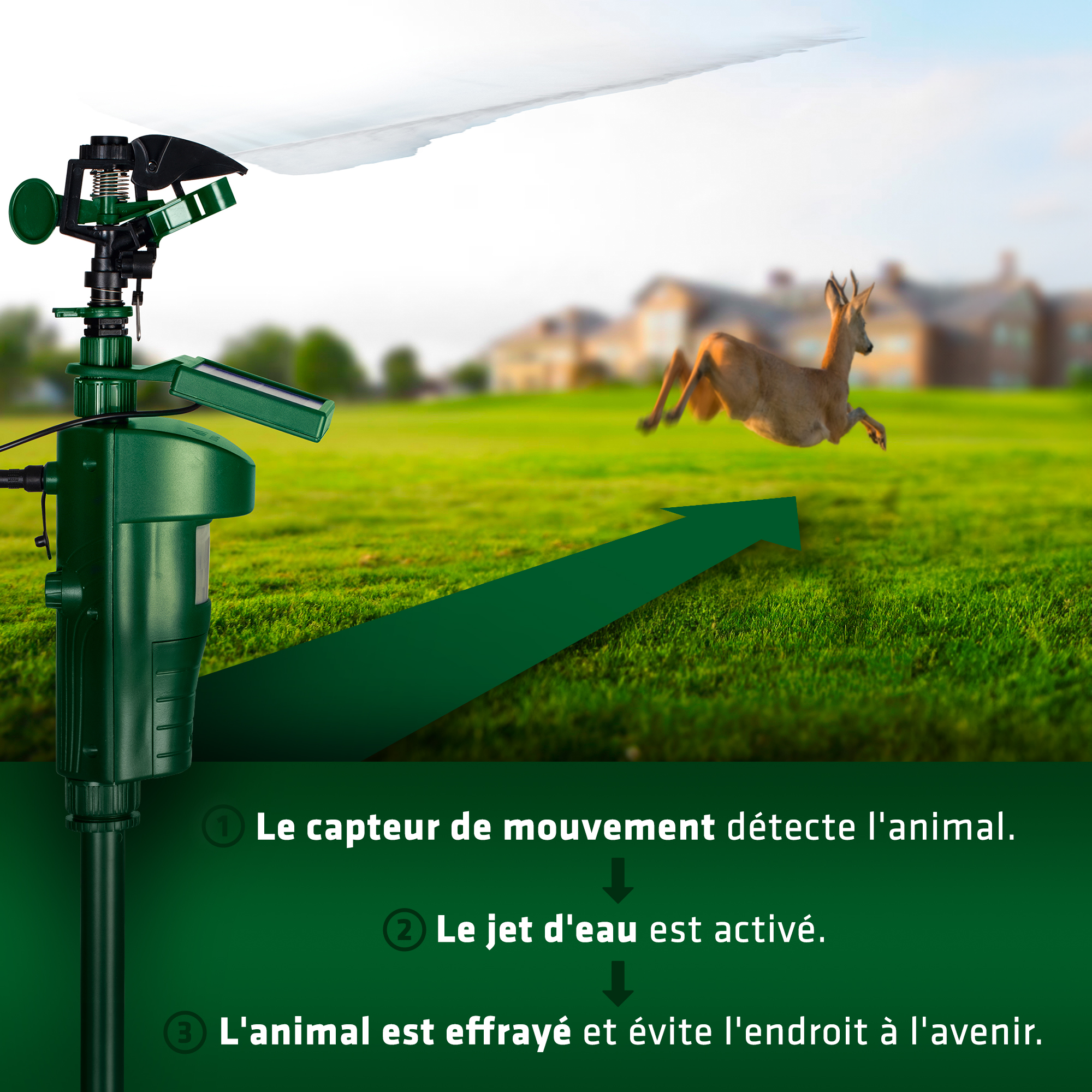 Avez-vous des visiteurs non désirés dans votre jardin ? Les chiens, les chats, les ratons laveurs, les lapins, les oiseaux, la faune sauvage et même les hérons peuvent être effrayés par un jet d'eau, ce qui permet de maîtriser les problèmes causés par ces animaux. Protégez votre propriété, votre potager et votre étang à poissons !
