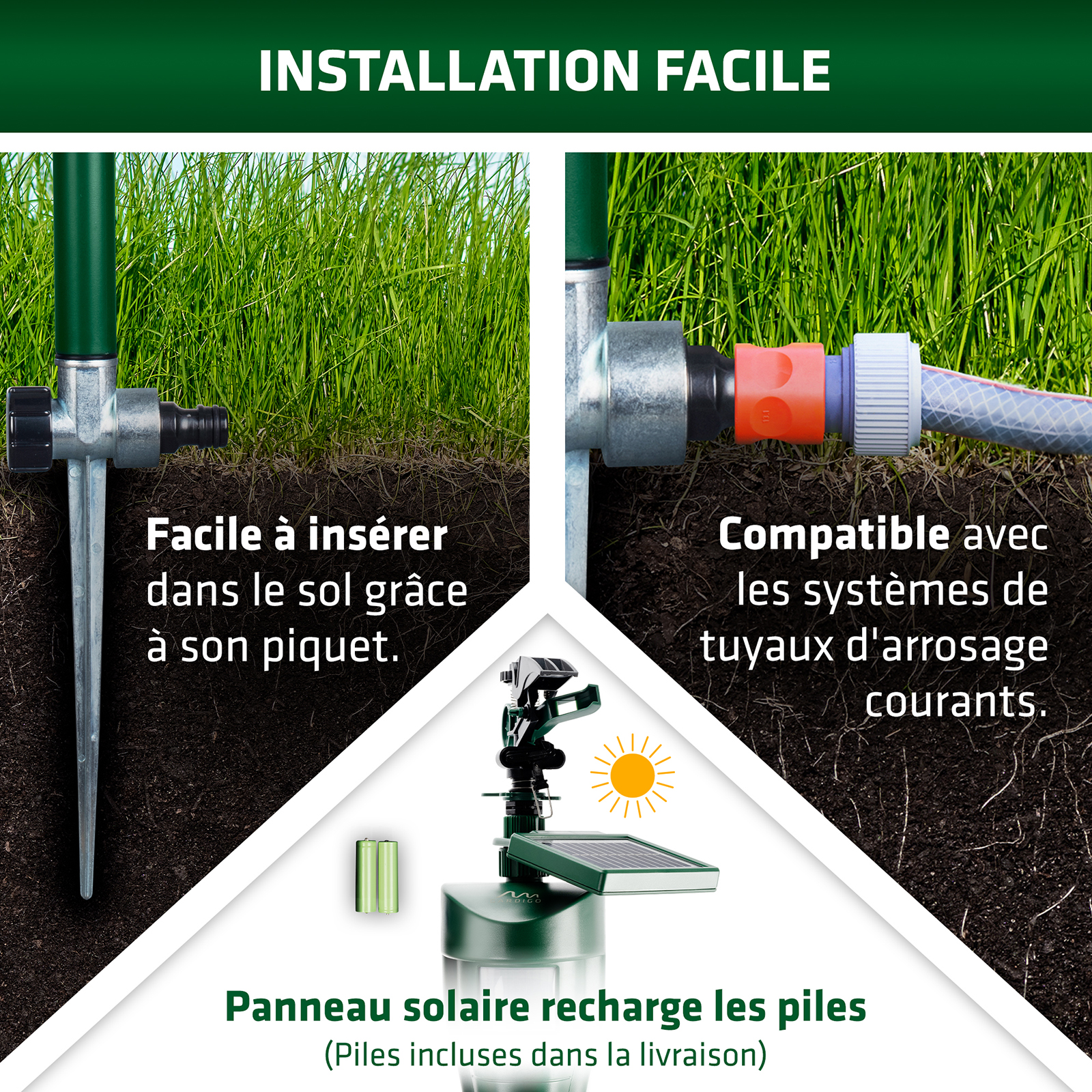 L'installation est très simple : avec son pieu de terre, l'appareil est enfoncé dans le sol. L'alimentation en eau se fait via des systèmes de tuyaux de jardin courants. Le pulvérisateur est réglable : vous pouvez ajuster à la fois la portée et l'angle couvert en fonction de votre problème. Les batteries fournies sont chargées par le grand panneau solaire.