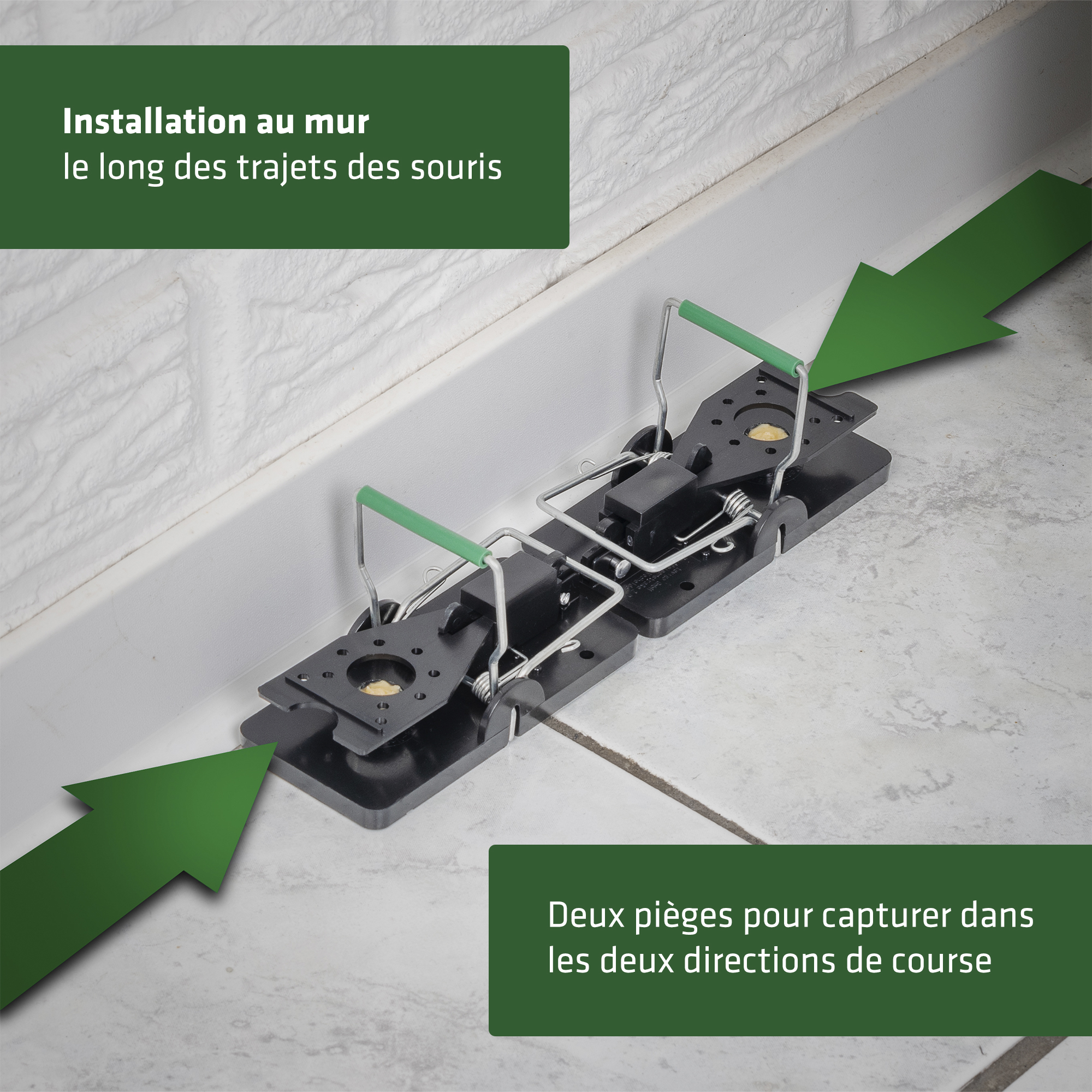 Placez ensuite le piège le long des chemins empruntés par les souris. Elles se déplacent généralement le long des murs. Il est préférable de placer deux pièges côte à côte pour capturer les souris dans les deux directions possibles.