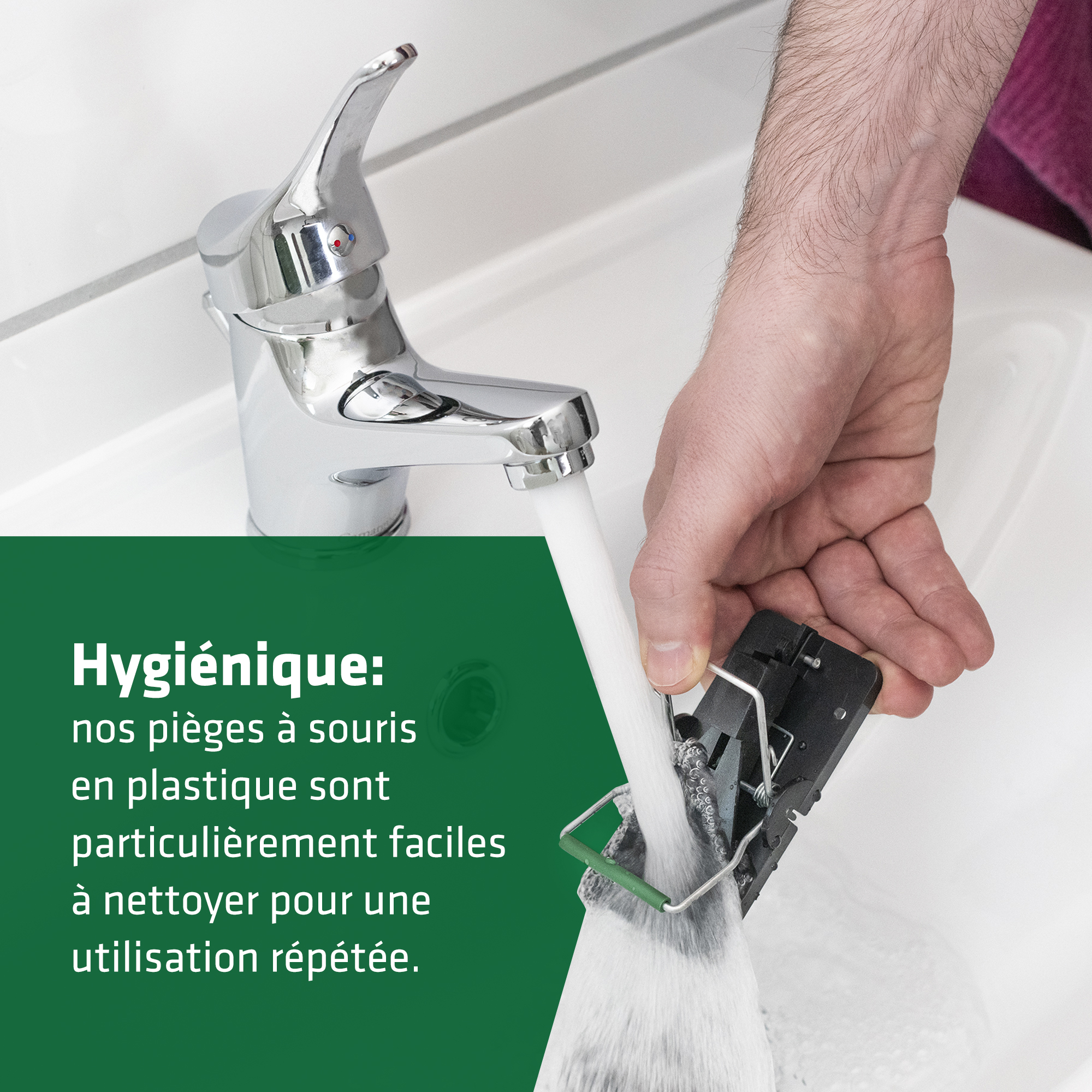 En appuyant sur le levier, vous pouvez retirer la souris capturée de manière hygiénique et sans contact. Grâce à sa fabrication en plastique robuste, le piège peut facilement être lavé et ainsi réutilisé.