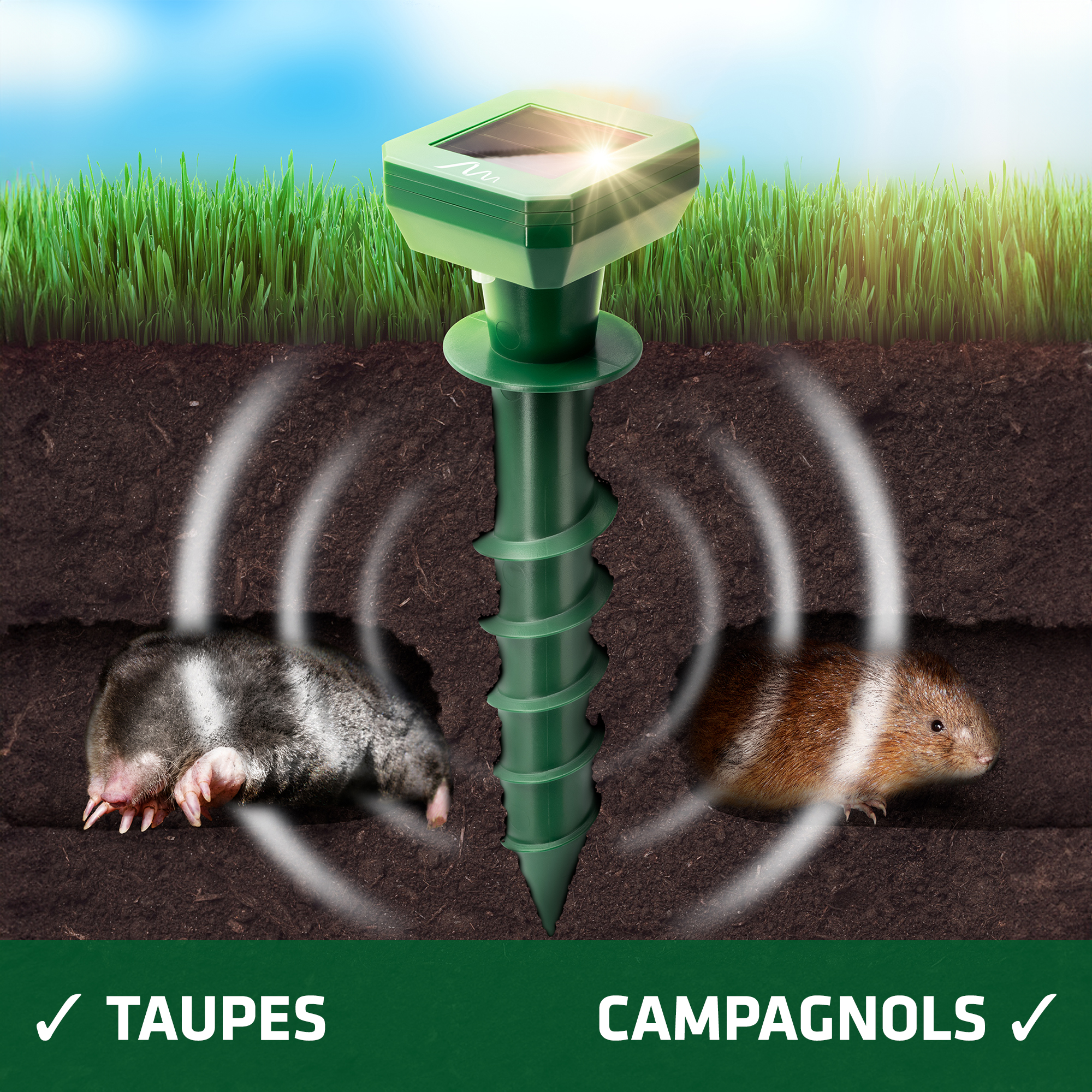Que ce soit des taupes, campagnols ou autres animaux fouisseurs, les sons émis créent un environnement désagréable qui les pousse à fuir sans nuire à vos animaux domestiques ni à la nature.