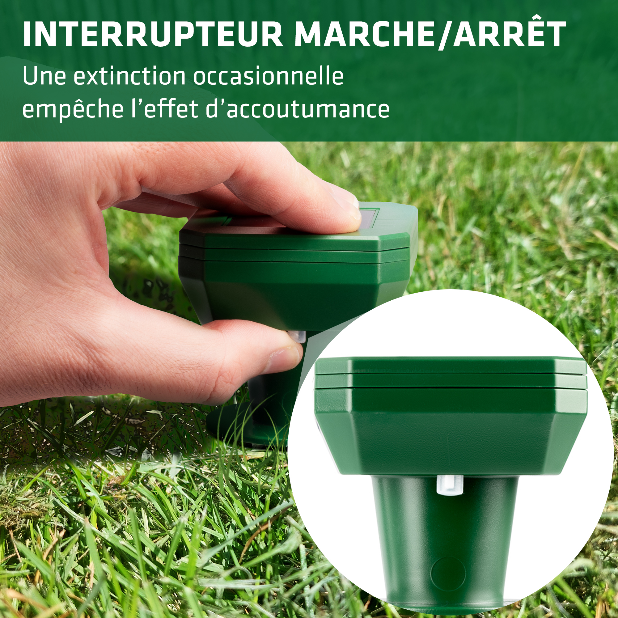 Son grand panneau solaire intégré alimente le dispositif en continu. Il diffuse automatiquement des vibrations sonores toutes les 35 secondes, qui perturbent les rongeurs souterrains et les incitent à quitter la zone.