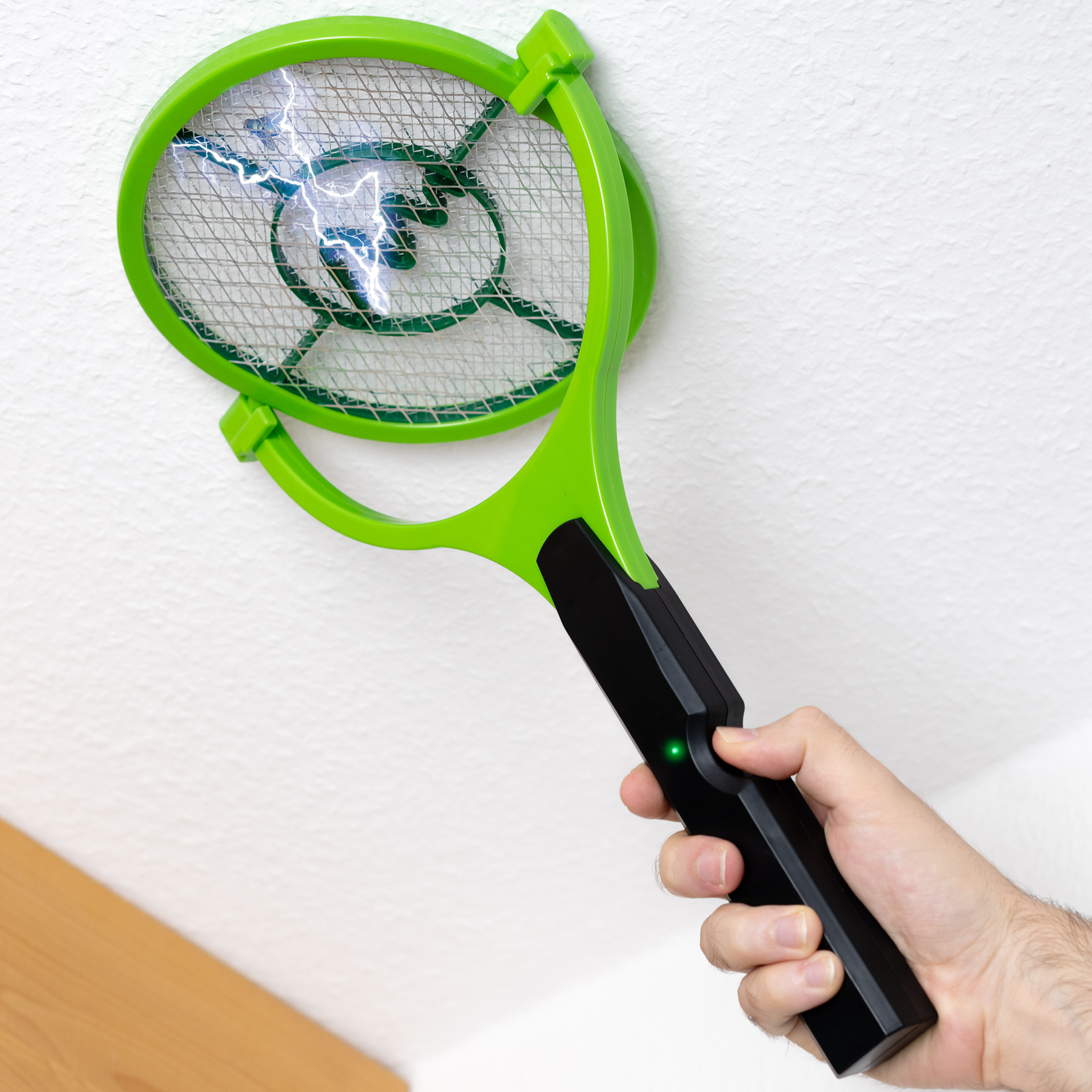 Alimentée par 2 piles AA (non incluses), elle génère une décharge sur un grillage haute tension activé uniquement lorsque les deux boutons du manche sont pressés simultanément – un système de sécurité fiable, même pour les foyers avec enfants.