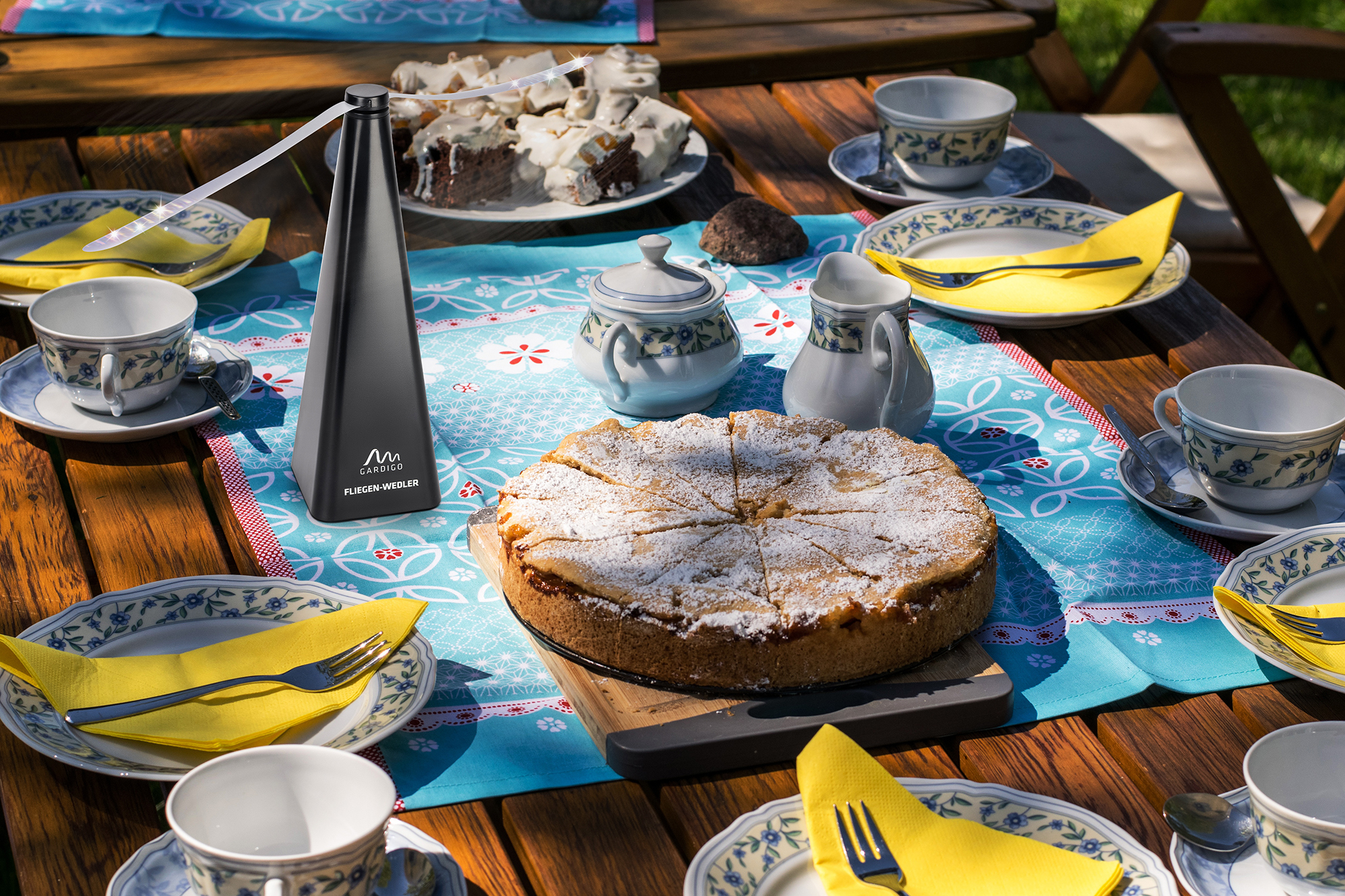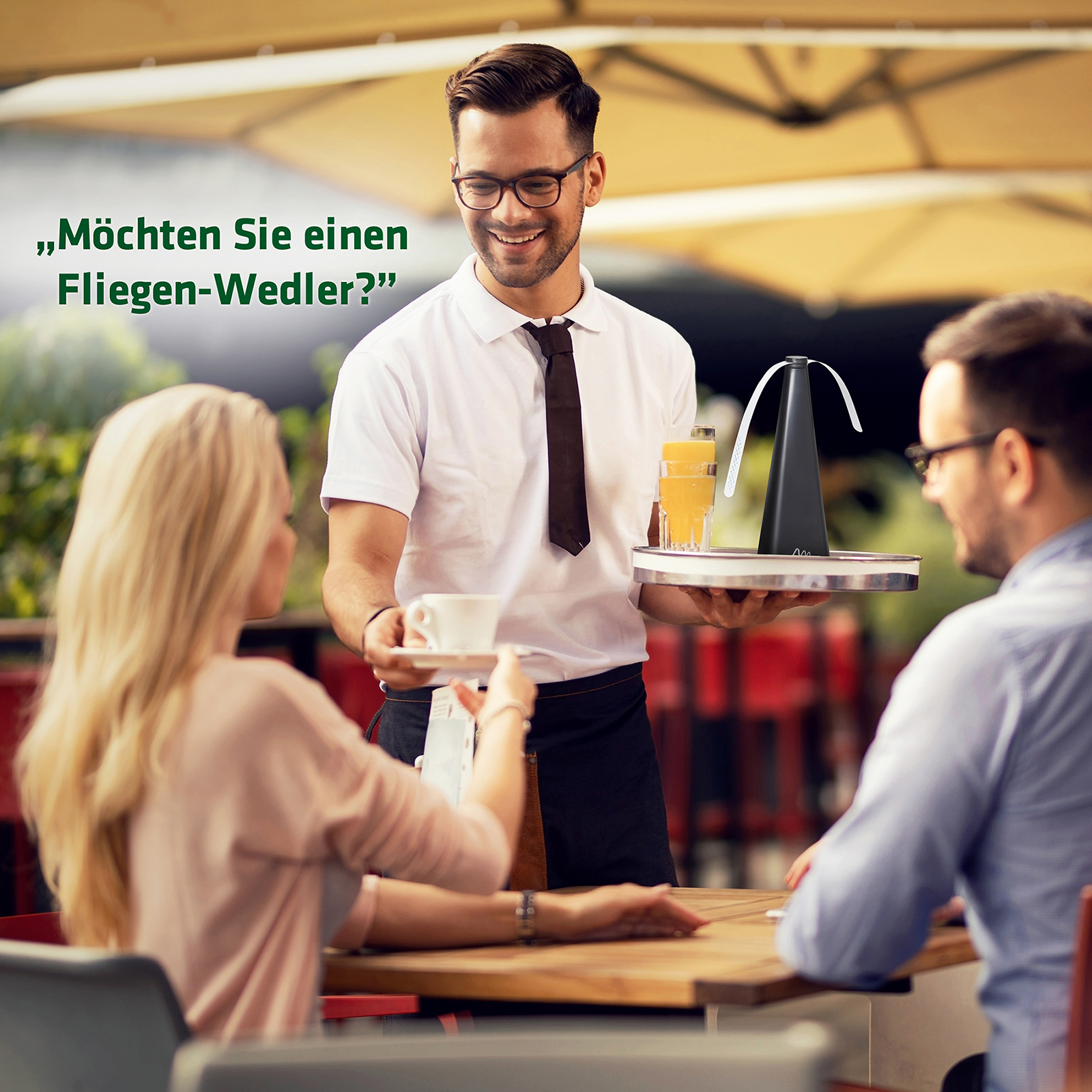 funktioniert einfach! Immer werden 2 Wedler im Außenbereich auf den Tisch gestellt. Beim Frühstück, Mittags und beim Kaffee mit Kuchen sowie beim Abendbrot. Wenn er mal nicht wedelt, rufen die Kids schon. Fliegen auf dem Essen!