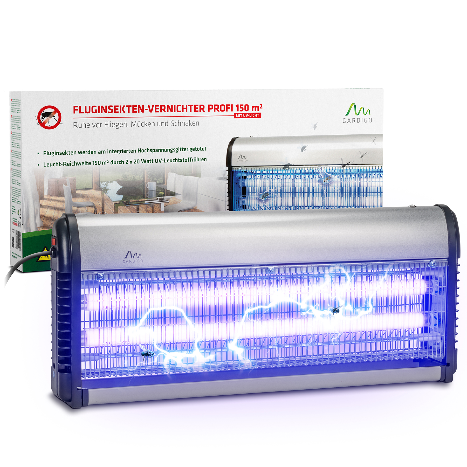 Informations sur le produit "Destructeur d’Insectes PROFI – 150 m² | 2 Tubes UV 20W | Grille Électrique | Usage Intérieur"