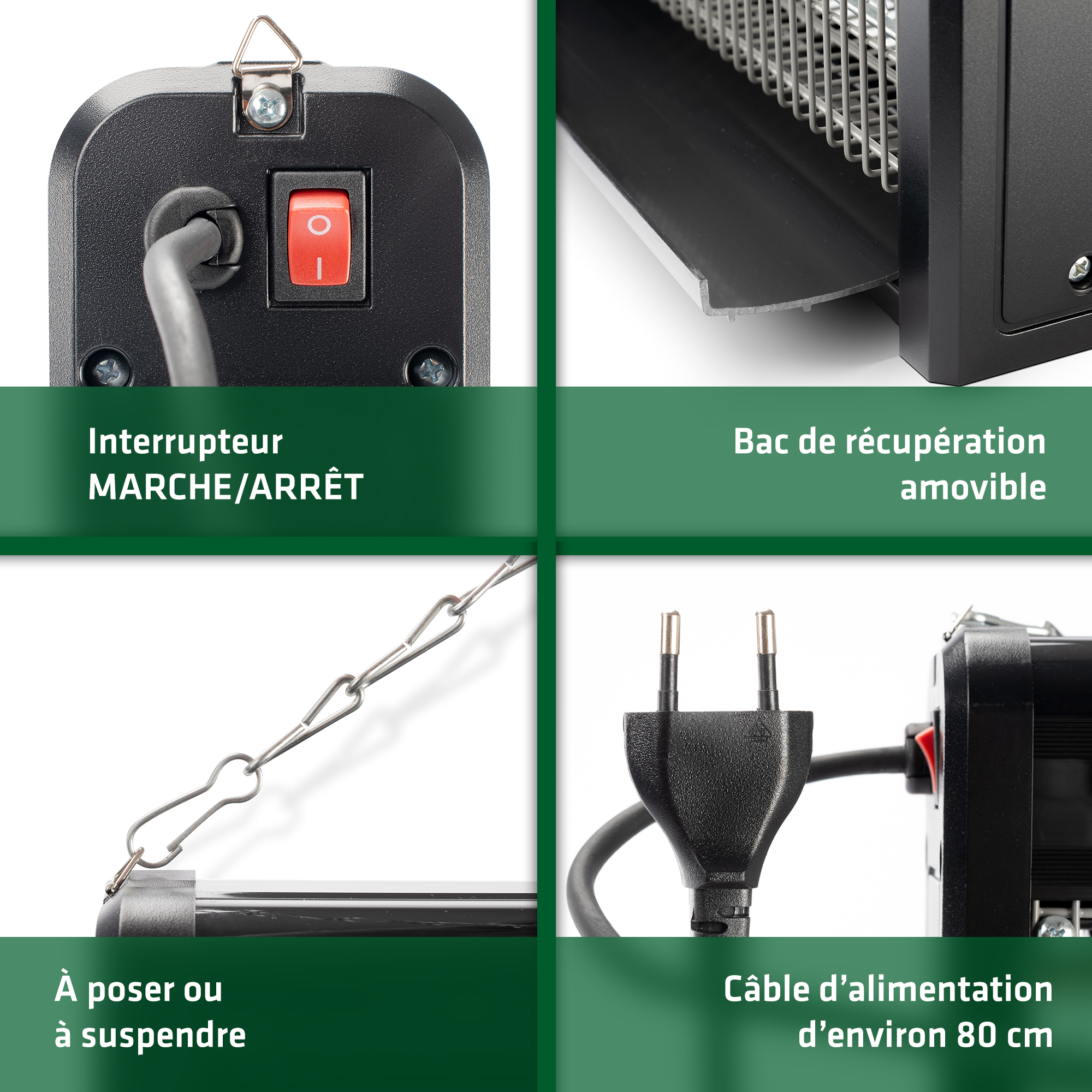 Le destructeur peut être installé sur une surface plane ou suspendu à l’aide de la chaîne fournie. Il se branche simplement sur secteur et fonctionne en continu pour une protection optimale.